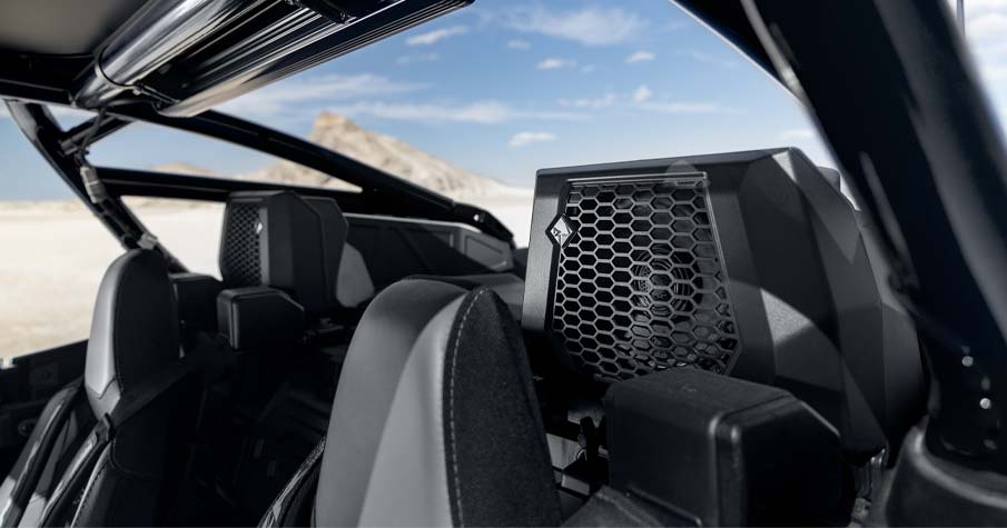 - Système audio Rockford Fosgate Stage 4 réglé en usine et intégré avec unité source RIDE COMMAND. Comprend (1) amplificateur numérique 8 canaux de 1 500 W, (2) tweeters 100 W 1 po, (2) haut-parleurs avant 100 W 6,5 po, (2) haut-parleurs arrière coaxiaux 100 W 6,5 po et (1) caisson de graves 10 po. *Le système audio est certifié IPX7 et IPX9K pour résister à l'immersion dans l'eau.