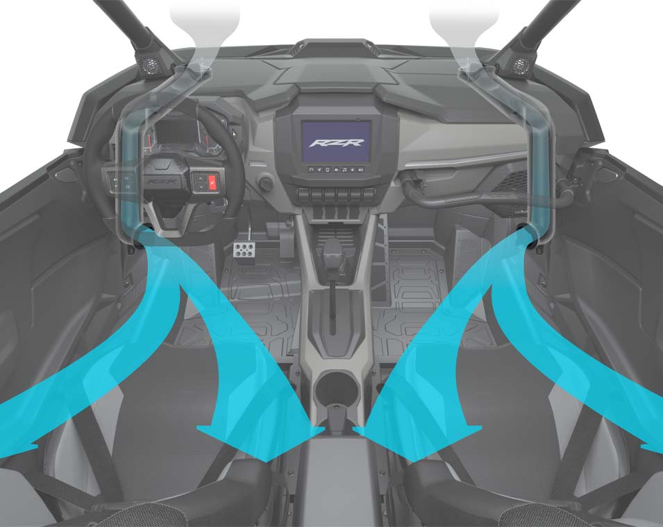 - Éclairage d'ambiance animé RZR Fang signature ; feux de position/feux de route à LED blancs et feux arrière/feux de freinage à LED rouges ; éclairage d'ambiance intérieur animé.